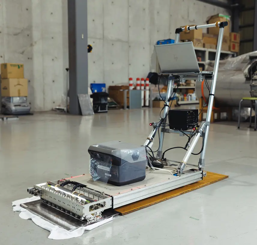 EASYS-TBの要は、20個の超音波センサーで400mm幅を同時スキャンする設計にある。通常より多くのセンサーを使い、従来よりも遥かに広い範囲を短時間で計測可能にした。データはリアルタイムにPCへ転送され、タンク底板の“減肉”をその場で判定できる。また、装置の進行方向には赤いレーザーマーカーが走り、オペレーターの視認性と操作性を劇的に向上。見た目にも「未来感」があるこの機能は、後発ゆえの“逆転のアイディア”だった。